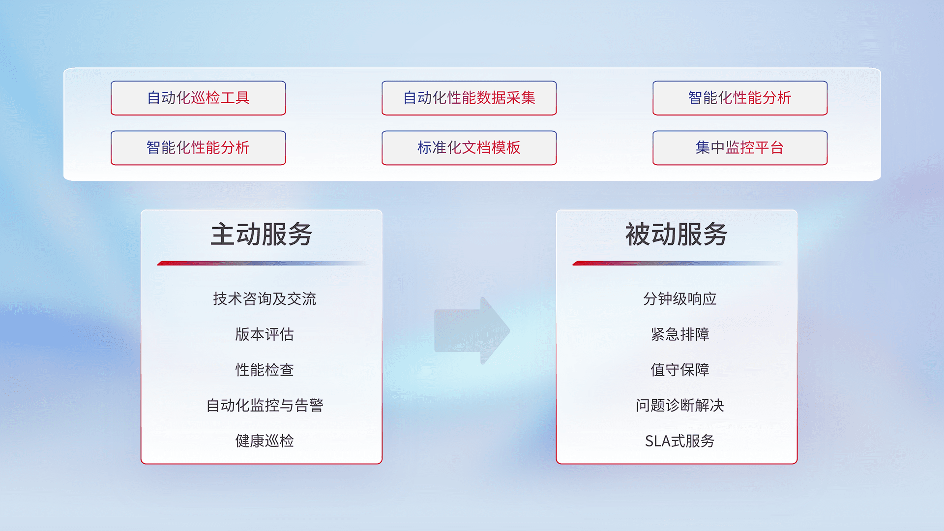 智能化工具和标准化文档,,,,保障服务质量,,,提供主动服务(包含技术咨询、、、版本评估、、性能检查、、自动化监控与告警、、健康巡检)和被动服务包含(分钟级响应、、紧急排障、、值守保障、、、问题诊断解决、、、、SLA服务)。。。。