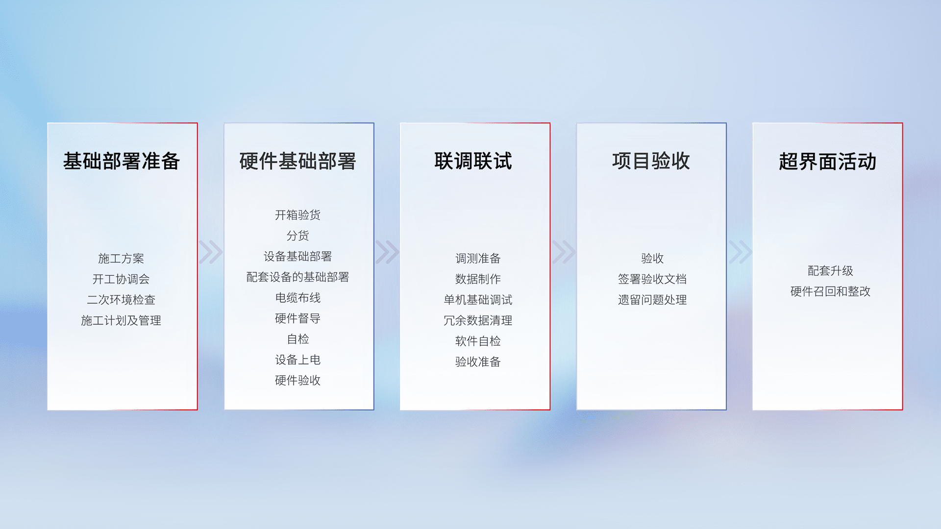 从基础部署准备、、、、硬件基础部署、、、、联调联试、、、、项目验收、、、越界面活动的全过程可追溯,,,,保证施工质量和进度。。。
